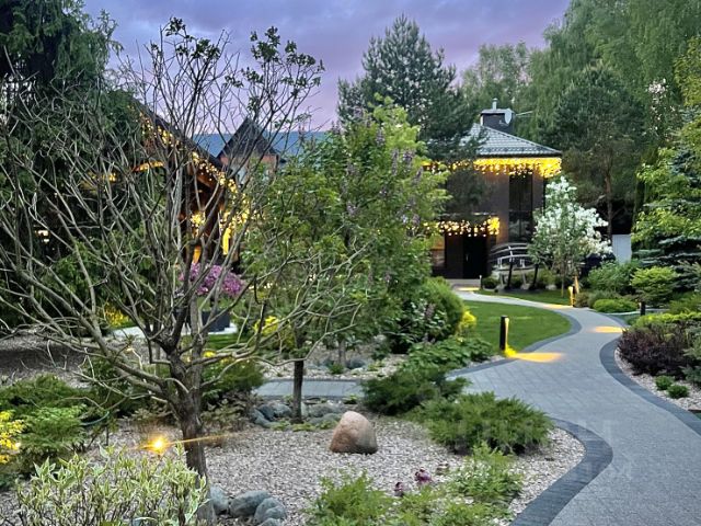 Территория виллы - продолжение архитектурной идеи. Ландшафтный дизайн включает газон, малые архитектурные формы, барбекю-зону и две просторные террасы. Гараж на 4 автомобиля оснащён системой подзарядки электромобилей. Архитектурная подсветка фасада и сада создаёт вечернюю атмосферу уюта и статуса.
