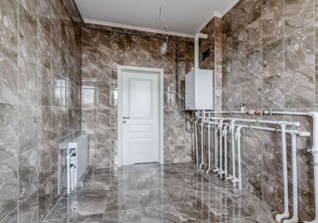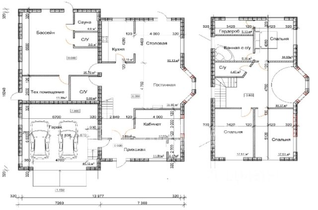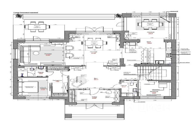 В основном доме на первом этаже можно оборудовать две спальни, на втором этаже три спальни. Отделка стен выполнена декоративной штукатуркой, использованы натуральные материалы для лестницы и дверей - дуб, пол - инженерная доска. Теплые полы разведены на первом этаже, на втором этаже в санузлах. Установлено кондиционирование.