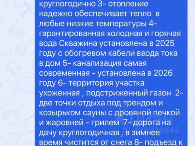 Коммуникации - все подключены; электричество 15 кВт, три фазы, подключено; газ в перспективе; летний водопровод, скважина (50 м); канализация, септик; возможно подключение телефона; возможно подключение интернета. Подъездная дорога: гравий, круглогодичный подъезд, протяженность от асфальта 1 км.
