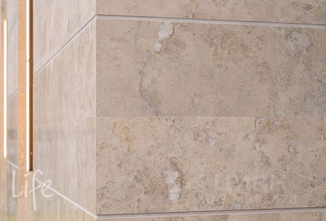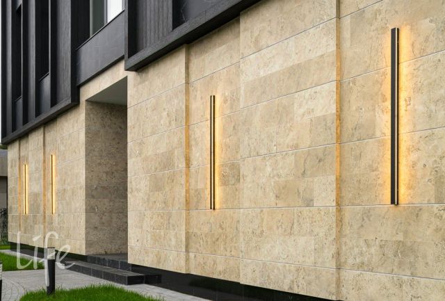 Фасад дома отделан клинкерным кирпичом, мрамором и лиственницей.