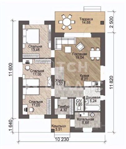 На 1 этаже: кухня-гостиная, спальня, техническая комната, совмещенный санузел с душевой кабиной, прихожая. Из гостиной выход на террасу.