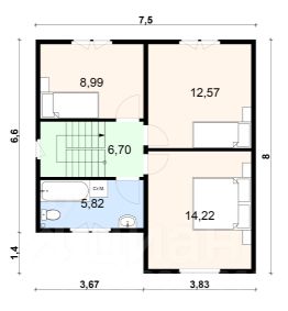На 1 этаже терраса площадью 27 кв. м, кухня 20 кв. м, гостиная 18 кв. м и комната 14 кв. м, а также санузел, техническое помещение, холл и тамбур. На 2 этаже гостиная 10 кв. м, три комнаты площадью 14 кв. м, 18 кв. м и 23 кв. м и санузел.