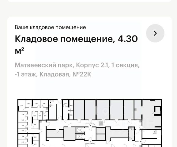 Продается кладовка на -2 этаже События 3. - Рядом с лифтовым холлом 2-й секции. - Удобная погрузка/разгрузка. - Собственник.