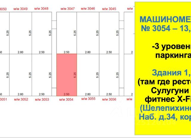 Уникальное предложение! Место 3054 расположено на -3 уровне паркинга. Площадь 13,1 м² ОСОБЕННО удобно для жильцов Здания 1 и Здания 2. Для жильцов здания 3 также подходит. адрес расположения Шелепихинская Наб. д.34, корп.2 (Здание 1,2,3) Въезд в паркинг Р2 (с улицы Шеногина)
