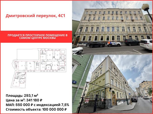 Продается просторное помещение на Дмитровском переулке в самом сердце Москвы общей площадью 293,1 кв.м.. Площадь разделена на 2 части под 2 арендаторов с отдельным входом для каждого из них. Первый арендатор - музыкальная школа с индексацией 7% от года к году. Второй - багетная мастерская с индексацией в 8%. На данный момент общий МАП - 550 000 рублей. Помещение подходит под любой вид деятельности: офис, магазин, салон красоты. Закрытый тихий двор. Арендаторам предоставлены кнопки от автоматических ворот. Днем есть возможность припарковать автомобиль. По запросу вышлем полную фотосессию объекта и флаер. Оперативный показ. Готовы к работе с агентами. Использование и копирование любых материалов без разрешения запрещено. Купить гараж в переулке Брюсов в Москве.