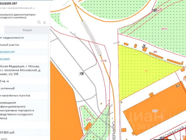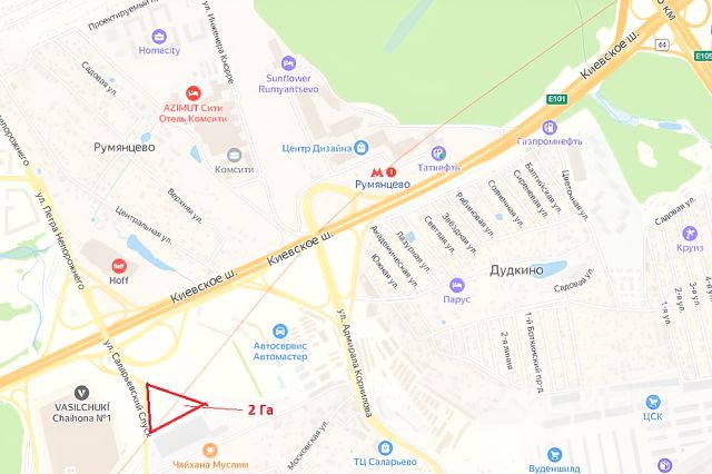 Продается участок 2 Га. 300 метров от Киевского шоссе, 250 метров от станции метро Саларьево. Категория земель: Земли населенных пунктов. Разрешенное использование: Для размещения многофункционального административно-торгового и производственно-складского комплекса. Имеются возможности присоединения к основным сетям коммунальных коммуникаций.