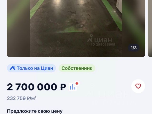 Просторное теплое машиноместо. Один взрослый собственник. Ипотеку рассматриваем. Свободная продажа.