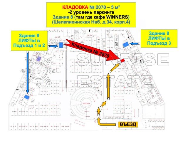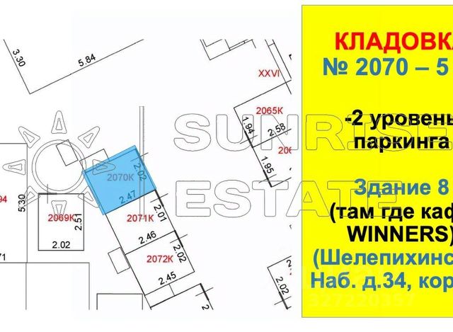 Продается КЛАДОВКА 2070 расположенная на -2 уровне паркинга под зданием 8, под секцией 3. Площадь 5м² (ширина 2м / длинна 2,5) ____________________ Удобный ПРЯМОЙ заезд в паркинг Р11 (с Шелепихинского шоссе) ! ____________________ Адрес расположения Шелепихинская Наб. д.34, корп.4 (Здание 8). _____________________