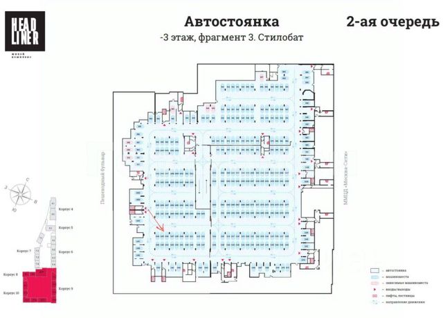 Продается машино-место в ЖК HEADLINER, корпуса 8, 9 и 10 Машино-место в трехуровневом подземном паркинге площадью 16.10 кв. м на под корпусами 8, 9 и 10 (вторая очередь) жилого комплекса HEADLINER. Паркинг вмещает 820 машиномест. Специальные условия по ипотеке Гибкие программы рассрочки Особенности: • Форматы машино-мест: стандартные для одного автомобиля и семейные, рассчитанные на две легковые машины или один крупногабаритный автомобиль. • Видеонаблюдение, охрана и система контроля доступа 24/7. • Прямой доступ из жилых секций, что позволяет быстро и безопасно попасть к автомобилю. • Гостевая парковка для посетителей. Престиж: машино-место в ЦАО повышает ликвидность недвижимости. Жилой квартал HEADLINER — это ансамбль из 10 монолитных зданий в ЦАО в престижном Пресненском районе Москвы. Захватывающие виды на Москва-Сити и Москву-реку. Планировки от студий 29 кв.м до просторных 3-комнатных квартир 115 кв.м, высота потолков от 3,1 м. Доступны варианты с отделкой и без. HEADLINER - бизнес-класс для тех, кто выбирает статус.