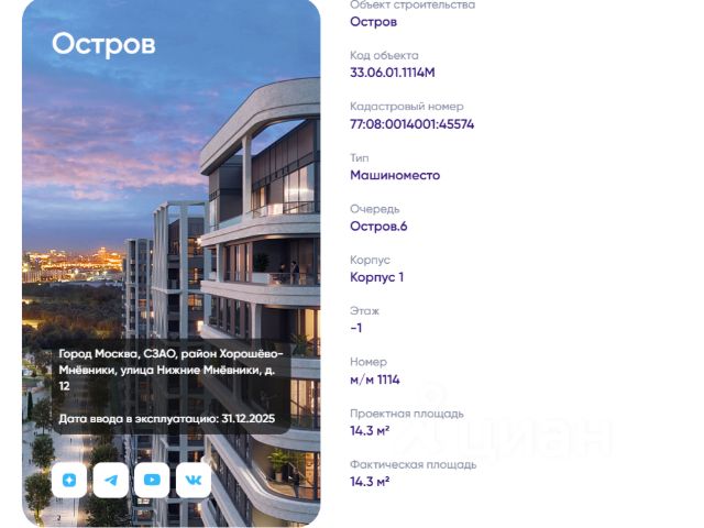 Остров 6, корпус 1, -1 этаж. Номер м/м 1114. 14.3 м². +Брелки от паркинга получены, м/м в собственности. +Расположено у стены, что позволяет расположить сзади велосипеды или сделать шкаф для хранения инструментов, вещей. + Минус первый этаж - наиболее безопасный уровень парковки благодаря повышенной защищённости. + ММ в готовом корпусе, который уже введен в эксплуатацию и соответствует высоким стандартам качества строительства. + Круглосуточная охрана, видеонаблюдение, автоматические ворота. Собственник. Готов к быстрой сделке. Продам гараж в округе СЗАО в Москве.