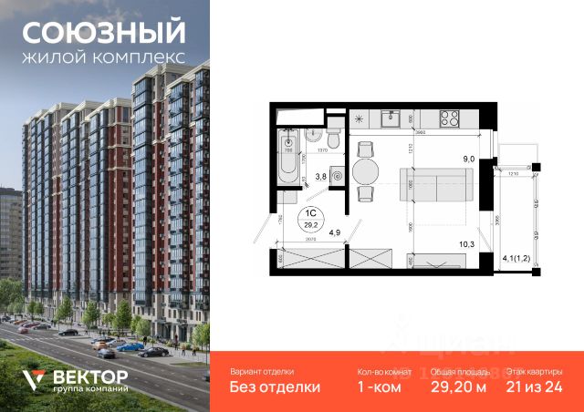 Продается 1-комн. квартира площадью 29,2 кв.м на 21 этаже 24 этажного дома в ЖК "Союзный" от федерального девелопера ГК "Вектор". Расположение, транспортная доступность Жилой комплекс "Союзный" — это квартал из 6 монолитных домов комфорт-класса высотой до 25 этажей, строящийся в 8-ом микрорайоне города Одинцово на улице Маковского. В продаже квартиры площадью от 37,2 до 88 кв. м, с потолками высотой 2,7 м, лоджиями, 2-мя санузлами в квартирах с 3-мя комнатами. Квартиры без отделки и с отделкой эконом, бизнес или комфорт класса. Квартал располагается на территории с отличной транспортной доступностью: - 8 км от МКАД; - 15 минут пешком до станции "Одинцово" МЦД-1; - рядом находится автобусная остановка, от которой можно доехать до метро "Парк Победы", "Киевская", "Юго-Западная"; На личном автотранспорте доехать от комплекса по Минскому шоссе к новой развязке с МКАД можно примерно за 20 минут. В качестве альтернативы можно выбрать Можайское шоссе. Даже в час пик передвигаться по нему можно со скоростью 50 км/ч. Кроме того, можно выбрать платную трассу Северный обход Одинцово. Путь от квартала до Северо-Западной хорды на автомобиле займет 25-35 минут, а до ТТК и Садового кольца - 1 час. В квартале запланировано строительство торгового центра, детского сада на 245 мест (сдача - 4 кв 2025 г.), многоуровневой открытой стоянки на 257 автомобилей, многоуровневого подземного паркинга, наземно-подземного паркинга с эксплуатируемой кровлей и других объектов. На внутренней территории квартала разместятся детский игровой комплекс с резиновым покрытием, спортплощадка, зоны отдыха для взрослых, деревья, кустарники и газоны. В шаговой доступности от ЖК "Союзный" располагаются школа, детский сад, профучилище, несколько ТЦ, кинотеатр "Юность", Ледовый дворец, сквер Союзный, Глазынинский пруд с качелями и площадкой для хоккея. В районе ЖК нет промышленных производств, а совсем близко начинаются лесные массивы, занимающие площадь свыше 70 000 га. Этот район считается одним из самых экологически чистых в Подмосковье.*