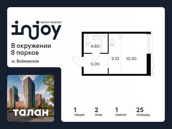 Прямая продажа от застройщика. В жилом квартале, расположенном в Войковском районе Москвы, продаётся 1-комнатная квартира площадью 25 кв.м без отделки. Квартира расположена на 2 этаже 35-этажного дома, корпус 1, в жилом квартале бизнес-класса INJOY. INJOY отделен от Ленинградского шоссе исторической застройкой и расположен всего в одном километре от магистрали: это возможность быстро добраться до центра или в любой район города по МКАДу или ТТК. Для автомобилей в INJOY — удобный подземный паркинг с доступом на лифте. Здесь же расположены кладовые площадью от 2,1 до 9 кв. м. Усилители сотового сигнала в лифтах и паркинге позволяют вести важные разговоры, не прерываясь на полуслове. Десятки мест отдыха вокруг INJOY дарят детям и взрослым запоминающиеся развлечения в любую погоду: от прогулок по паркам и природным зонам до интересного досуга в кругу семьи или друзей. 10 минут до парка Покровское-Стрешнево 12 минут до усадьбы Михалково 15 минут до Химкинского водохранилища 7 минут до ТРЦ "Метрополис" INJOY расположен в развитом сформировавшемся районе, что обеспечивает жителям обширную инфраструктуру в пешей доступности. МЦК "Балтийская" - 200 м Ленинградское шоссе - 1 км м. Войковская - 1 км ТТК - 7 км В проекте INJOY три очереди, разновидность которых формирует силуэт живого мегаполиса. Архитекторы международного бюро AI Studio придали индивидуальность каждому корпусу, чтобы все уголки INJOY обрели особенный характер. Планировки и форматы квартир уникальны: пентхаусы, квартиры с террасами, мастер-спальнями, выходом на променад, угловым остеклением, лоджиями, гардеробными, кладовыми и постирочными. Внутренний двор INJOY продолжает общую концепцию благоустройства и включает в себя: три детские площадки для разных возрастов, зону work-out, природную озеленённую зону, променад с зонами для релакса, йоги и амфитеатром с арт-объектами. Закрытый двор, видеонаблюдение и контроль доступа обеспечивают безопасность каждому жителю комплекса. Стоимость квартиры - 15553500 Р. Срок сдачи - 1 квартал 2027. Более подробную информацию по объекту уточняйте по телефону и в отделе продаж. Купить квартиру гостинку рядом с метро Войковская.