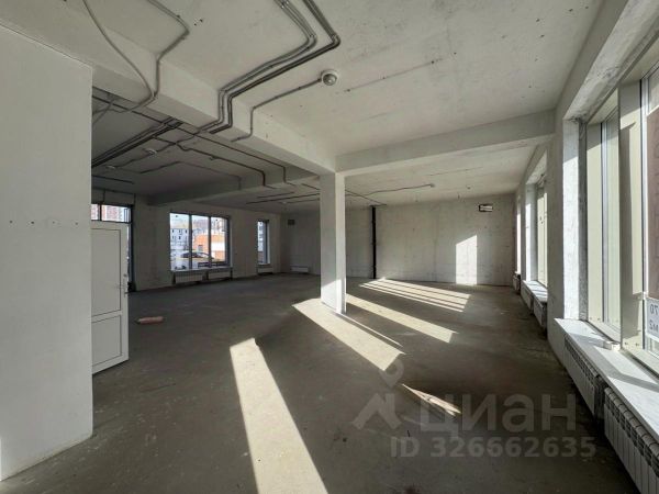 Помещение расположено на высоком цокольном этаже, полноформатные окна, высокие потолки.