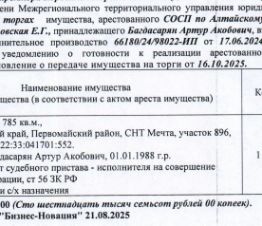 Лот7 Земельный участок, назначение земли сельскохозяйственного назначения для садоводства, кадастровый 22:33:041701:552, площадь 785 кв.м., адрес: Алтайский край, Первомайский район, СНТ "Мечта", участок 896. Начальная цена 116...