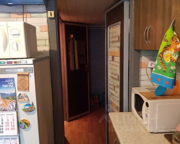 Комната светлая, обои в светлых тонах, есть шкаф и сервант, холодильник, кресло и диван, заходи и живи. На кухне своё место возле окна с верхним и нижним шкафами и подключенной стиральной машиной.