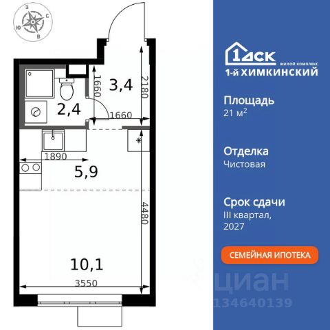 БЕЗ ПЕРВОНАЧАЛЬНОГО ВЗНОСА! • ИПОТЕКА 10% ДЛЯ ВСЕХ БЕЗ НАЦЕНОК • ДОСТУПНО ПО СЕМЕЙНОЙ ИПОТЕКЕ Прямая продажа от застройщика! Жилой Комплекс класса Комфорт. Продаётся квартира-студия номер 22 общей площадью 20.1 кв.м. на 4-м этаже 17 этажного здания. Без отделки. Особенности квартиры: - Линейная планировка - максимальная функциональность и удобство. - Ниша под шкаф - компактное и удобное место для вещей. Информация о комплексе: Квартал класса комфорт плюс, где современное городское пространство граничит с удивительной природой вокруг. 1-й Химкинский расположен на территории в 102 га и органично вписан в природное окружение Химкинского леса и канала им. Москвы. В проекте предусмотрена богатая коммерческая инфраструктура с собственным торговым центром, общеобразовательные учреждения и социальные объекты. Изюминкой жилого комплекса будут спортивно-оздоровительный комплекс с термами и SPA и семейный парк развлечений. Транспортная доступность: ЖК "1-й Химкинский" дает возможность выбрать любой способ передвижения как до города, так и до самых разных объектов, которые могут представлять интерес для его жителей. Не важно, какой способ передвижения вы предпочитаете, успевать всегда и везде можно вне зависимости от выбора транспорта. - 8 мин. пешком (800 м) до остановки "Золотая Арка" -10 мин пешком (1 км) до остановки "Поворот на Ивакино" Внутренняя инфраструктура: - Безопасность: закрытые дворы без машин, безбарьерная среда и сквозные подъезды, камеры на детских площадках с возможностью трансляции на смартфоне - Идеальный отдых в кругу семьи: семейный парк развлечений на территории, торговый центр (2-х этажный) общей площадью более 8 тыс. кв. м с фудкортом - Образование: 3 детских сада и современная муниципальная школа на 2450 мест - Спортивная среда: закольцованный веломаршрут с навигацией, спортивный комплекс с термами, закрытый тренажерный зал и зоны ворк-аута - Социальные объекты: поликлиника со станцией скорой помощи, пожарное депо - Подземный паркинг и кладовые помещения на -1 этаже, станция техобслуживания и автомойка на территории