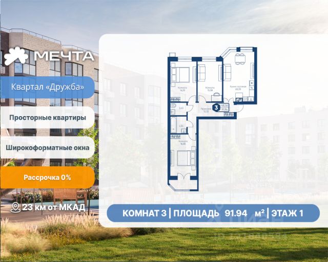 Рассрочка 0% от застройщика! Продается трехкомнатная квартира в квартале "Дружба" жилого комплекса "Мечта". Общая площадь квартиры: 101.09 кв. м, этаж 1 из 5. Срок сдачи: 2 квартал 2026 г. Отделка: Получистовая ОСОБЕННОСТИ: - Мастер спальня - Просторная кухня-гостиная - Просторная прихожая - Гардероб - 3 спальни - 2 санузла - Застекленная лоджия - Высота потолка: 2.7 метра Квартал "Дружба" состоит из пяти пятиэтажных домов с несколькими подъездами. Каждый дом оборудован широкими окнами, которые обеспечивают максимальный доступ естественного света и открывают прекрасный вид на окружающую природу. Квартал отличается большими застеклёнными лоджиями, которые позволяют наслаждаться свежим воздухом и красивым видом, не покидая своего жилища. Жилой комплекс "Мечта" расположен в 23 км от МКАД по Дмитровскому или Ленинградскому шоссе. ТРАНСПОРТНАЯ ДОСТУПНОСТЬ: - 15-20 минут на общественном транспорте до МЦД-1 "Лобня" - 30-35 минут на общественном транспорте до метро "Физтех" - 45-50 минут до станций метро "Савеловская" или "Белорусская" - 30 минут на автомобиле до Москвы Инфраструктура включает в себя муниципальную школу и детские сады, кабинет врача общей практики, множество кафе и ресторанов, а также различные спортивные и детские площадки. В пешей доступности от жилого комплекса расположены лес и три реликтовых озера — Долгое, Круглое и Нерское, а также реки Альба, Уча и Волгуша. Территория жилого комплекса закрыта для посторонних, находится под охраной и патрулируется. На въезде расположен КПП. Камеры видеонаблюдения работают круглосуточно на всей территории. Вы и ваши дети будете чувствовать себя в безопасности.