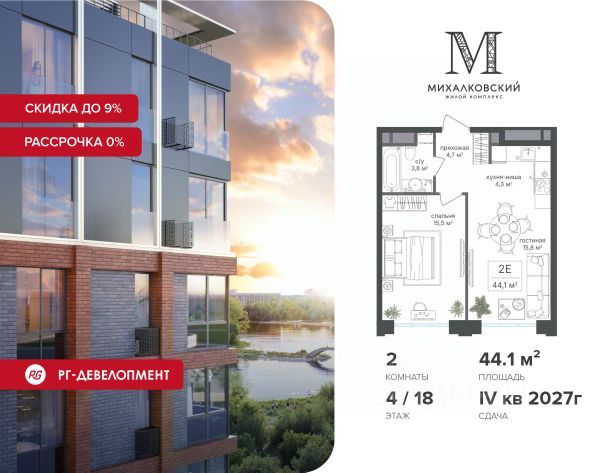 При приобретении квартиры доступна беспроцентная рассрочка с первым платежом от 30%. У покупателя также есть право воспользоваться скидкой в размере 5% от полной стоимости квартиры. - Первый платеж составляет 30% от стоимости объекта и вносится при заключении ДДУ - Второй платеж в размере 30% от стоимости объекта вносится через 6 месяцев с даты заключения ДДУ - Остаток 20% через 12 месяцев с даты заключения ДДУ, но не позднее 30.06.2027 - Остаток 20% не позднее 30.06.2027 - Действует на приобретение квартир в корп. 2, 7 Продаётся 2-к квартира 41,9 кв.м. в ЖК "Михалковский" на 7-м этаже 20 этажного дома. Скидка 9% при покупке квартиры! Ипотека для каждого! Полная стоимость кредита от 12,380% до 18,537%. Ставка от 0,11% в АО "Альфа-Банк", ген. лицензия ЦБ РФ 1326 от 16.01.2015. Ставка фиксируется на первые 12 месяцев, далее полная стоимость кредита от 22,022% до 24,599% ставка 21,59%. Первоначальный взнос — от 20,1% от стоимости квартиры. Срок кредитования — от 4 до 30 лет. Компания "РГ-Девелопмент" предоставляет скидку на квартиры в жилом комплексе. Акция действительна до 31.03.2026 включительно. Для того чтобы воспользоваться предложением, необходимо подписать договор на приобретение недвижимости до 31.03.2026 включительно. Действует программа "Растет семья - растет и квартира". Компания "РГ-Девелопмент" вошла в ТОП-10 девелоперов по объёму введённого жилья в "Старой Москве" по итогам 2025 года. Прямая продажа от застройщика! Квартиры без отделки. Срок сдачи IV кв. 2027г. Особенности проекта: Завораживающие виды Красивое благоустройство Уникальная локация для Москвы (рядом Головинский парк, пруды, усадьба Михалково) Рядом с центром В проекте присутствует: архитектура голландского бюро MLA+, зеленые зоны, транспортная доступность, благоустроенная территория, подземный паркинг, детский сад и выход на Головинский парк с пятью прудами. Название комплекса указывает на одну из его черт - соседство с имением Михалково. Позвольте себе жить в месте, где проводили свой досуг династии Дашковых и Паниных.