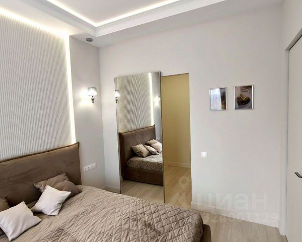 В мастер-спальне мягкие стеновые панели с зеркальными вставками и большим зеркалом (высота 3 метра), а также гардеробная с наполнением.