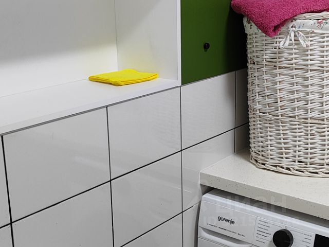 Ванная - литая столешница с раковиной, хорошая ванна, полки, ящики и стиральная-сушильная машина.