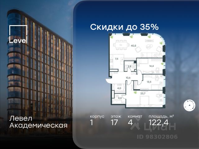 Цена указана с учётом скидки при 100%-й оплате, несубсидированной ипотеке, рассрочке (кроме программы "Рассрочка 0%"). В Академическом районе продаётся 3-комнатная квартира площадью 126.10 кв.м без отделки. Квартира расположена на 19-м этаже 19-этажного жилого комплекса бизнес-класса Левел Академическая (компания Level Group). Площади помещений определены кадастровым инженером по результатам обмеров. Отличная транспортная доступность: - 1 мин. пешком до станции метро "Академическая"; - 4 мин. на автомобиле до ТТК; - 8 мин. на автомобиле до Садового кольца; - 13 мин. на автомобиле до Кремля. Продуманный архитектурный проект: - современная архитектура от бюро UNK project; - высокие потолки в квартирах до 6,62 м; - окна в пол высотой 2,5-2,68 м с панорамным видом на МГУ, Москва-Сити и другие доминанты Москвы; - квартиры с моллированным остеклением - радиусные окна открывают увеличенный угол обзора; - более 20 вариантов планировочных решений; - уникальные квартиры с собственным патио и возможностью обустройства дровяного камина; - квартиры сдаются без отделки, что открывает свободу для создания интерьера по своему вкусу. Расположение: Камерный проект из 1 корпуса расположен тихом зеленом районе Москвы, в непосредственной близости к центру города. В округе построено 80 детских садов, 50 школ и 30 вузов, 7 из которых входят в топ100 вузов России: МГУ, МГИМО, РАНХиГС, МИСИС, РУДН, РЭУ им. Плеханова и РГУ нефти и газа им. Губкина. Этот район буквально утопает в зелени парков, начиная с уютного Академического в 6 минутах пешком и заканчивая одним из крупнейших в городе парком 50-летия Октября (12 минут на автомобиле). Общая площадь природных объектов в радиусе 2-6 км от дома - 476,5 га. Внутренняя инфраструктура: На территории жилого комплекса Левел Академическая откроется собственный торговый центр, а для отдыха жителей будут созданы общественные пространства: комфортное лобби с дизайнерской отделкой, окнами в пол и потолками высотой 4,5 м, а также две благоустроенные зоны - территория по периметру здания и пространство на стилобате. Во дворе на стилобате предусмотрены детская и спортивная площадки, коворкинг и лаунж-зона на открытом воздухе. Стилобат украсят скульптуры животных - жирафа, зайца и волка, которые станут ярким акцентом внутреннего двора жилого комплекса Левел Академическая, подчеркивая близость к музею Дарвина. Процент озеленения территории - 58%. Технологии и безопасность: Жителей жилого комплекса Левел Академическая не коснется ежегодное отключение горячей воды благодаря собственным центральным водонагревателям. Безопасность гарантирует круглосуточная охрана, безлимитный вайфай, круглосуточное видеонаблюдение. Удобное перемещение внутри комплекса будут обеспечивать 5 лифтов с доступом в паркинг с жилых этажей. п