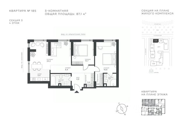 Успейте стать частью уникального проекта премиум-класса на западе Москвы! В продаже квартиры: 1-комнатные от 28,1 м²; 2-комнатные от 61,2 м²; 3-комнатные от 86,6 м²; 4-комнатные от 110,7 м². Первый взнос от 30%! Рассрочка на 2 года без переплат! Крылатское 33 это премиальный жилой комплекс от специализированного застройщика ООО "Сияние". Самый высокий небоскрёб в районе, достигающий отметки в 150 метров и малоэтажный клубный формат высотой от 42 метров на приватной территории площадью 1,4 га. Великолепные виды на излучину Москва-реки, Живописный мост и урбанистический облик города. Эксклюзивные форматы квартир с панорамным остеклением и патио-террасами. Двухуровневый паркинг на 271м/м, премиальные входные группы, ресторан высокой кухни, детский сад и эко-маркет на территории комплекса. Эксклюзивные преимущества: доступ к wellness-центру, коворкингу и клубной гостиной только для резидентов. Над проектом работали именитые российские архитектурные бюро: архитектор проекта бюро "Остоженка", планировочные решения от бюро Александры Федоровой. Расположение Пешком: 5-7 минут - до парка Звезд, Крылатского парка и набережной Москвы-реки; 15 минут - до метро Крылатское Арбатско-Покровской линии; 15 минут - до пристани Крылатская. На автомобиле: 10 минут - до Третьего транспортного кольца; 15 минут - до Садового кольца и Москва- Сити; 20-30 минут - до Аэропорта Внуково; 30-40 минут - до Аэропорта Шереметьево. В 300 метрах от комплекса - удобная транспортная развязка с проспектом Маршала Жукова, обеспечивающая легкий доступ к ключевым магистралям. Благоустройство: Просторная общественная гостиная; Коворкинг с кофе-баром, комфортные переговорные зоны с быстрым wi-fi, зарядными устройствами и библиотекой; Пространство friends lab для организации клубных мероприятий; Wellness-центр с фитнес-залом и массажными кабинетами; Ресторан высокой кухни; Частный детский сад; Детское кафе; Современный детский playhub; Спортивные площадки; Гипоаллергенный сад, безопасные водные пространства, декоративные пруды и сухие фонтаны; Высокоскоростные бесшумные лифты; Разделение зон для резидентов квартала и сервисного обслуживания. Окружение: - парки: Крылатские холмы, природно-исторический парк Москворецкий, Серебряный Бор; - учебные заведения: 5 образовательных комплексов, в которые входят 15 детских садов и 12 школьных корпусов. В удобной транспортной доступности гимназия им. Е. М. Примакова и международный лицей The International School of Moscow; - уникальные спортивные сооружения: гребной канал "Крылатское", легендарный велотрек "Крылатское", "Лата Трэк" для горнолыжников и сноубордистов, ледовый дворец "Крылатское"; - единственный в Москве парк развлечений под открытым небом, включающий более 70 вариантов досуга для любого возраста и времени года. Срок сдачи проекта: 2 квартал 2027 года. Финансирование и эскроу-счет обеспечены банком МКБ.