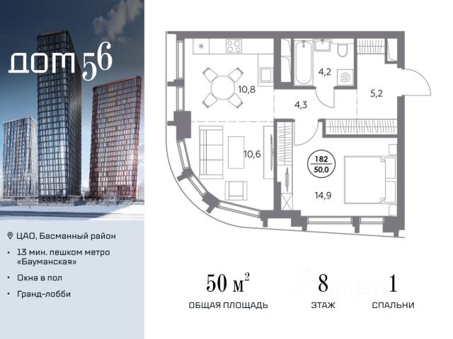 В премиум-квартале "Дом 56" на Бауманской напрямую от девелопера ГК "Галс-Девелопмент" представлена 2-комнатная квартира на 18 этаже общей площадью 72.50 м². Квартира предлагается без отделки, со свободной планировкой. Пространство позволяет воплотить дизайн - проект в соответствии с Вашими предпочтениями. "Дом 56" - расположен в Басманном районе на ул. Фридриха Энгельса, всего в 12-15 минутах пешком от станций метро "Бауманская" и "Электрозаводская". Рядом с премиум-кварталом находятся важные городские магистрали - ТТК, набережная реки Яузы и Бакунинская улица, переходящая в Спартаковскую и Маросейку. Архитектурный стиль "Дома 56" - параметрический минимализм. Футуристические фасады квартала с "эффектом закручивания" словно вращаются вокруг своей оси. Динамичный образ башен дополняет эффектное остекление - окна в пол будут в каждой квартире. "Дом 56" станет органичным продолжением современной научно-креативной среды Басманного района: - Развитое окружение - десятки различных точек притяжения; - Близость престижных вузов: МГТУ, МЭИ и Британская высшая школа дизайна; - Соседство с Технологической долиной и всем необходимым для запуска стартапа; - Набережные и парки для спорта и отдыха. "Дом 56" оснащён первоклассными инженерными системами. Входы на территорию, в здание и паркинг оборудованы системой контроля и управления доступом. С любого этажа в лобби и паркинг спускаются быстрые и бесшумные лифты премиального бренда. Во внутреннем приватном дворе будет создано пространство в бионическом стиле с лаунж-зонами, подвесными качелями, детскими плейхабами для разных возрастов, площадками для спорта и отдыха в окружении зелени. На двух подземных уровнях предусмотрен подземный паркинг и кладовые помещения.