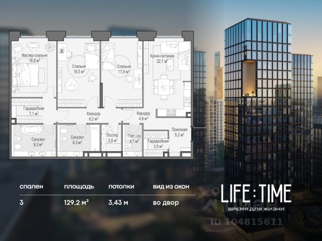 Окна квартиры выходят на северную и западную стороны. Пространство разделено на общедоступную и приватную зоны - ваши гости непременно оценят это преимущество. Предложение для успешных людей, а также ценителей городских панорам: из квартиры виден парк "Красногвардейские пруды". Life Time - роскошный современный квартал на Пресне, в наиболее быстро растущем премиальном районе ЦАО. Его насыщенная инфраструктура и выгодное расположение дарят время для жизни. Вы больше не тратите его на дорогу или ожидание, при этом ни в чём себе не отказывая. На территории предусмотрено всё для комфортной жизни: • двор-парк площадью 1,8 гектара с прудом и фонтанами; • Clubhouse - инфраструктурный центр в отдельном здании с исчерпывающими возможностями для спорта, отдыха и досуга только для жителей; • спортивная инфраструктура на улице и в помещении, в том числе бассейн длиной 25 метров, хот-таб, хаммам, сауна, бьюти-зона; • клубная гостиная с террасой; • всё для развития и досуга детей любого возраста, в том числе детский сад и школа. Life Time находится в центре сложившегося премиального района, в окружении многочисленных парков. Удобная транспортная доступность и прямой выезд на Звенигородское шоссе позволяют без проблем добраться до Садового кольца и Москва-Сити. Архитектурный стиль квартала - роскошный минимализм. Дома десятилетиями будут выглядеть современно.
