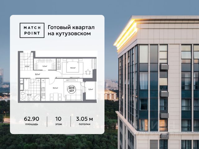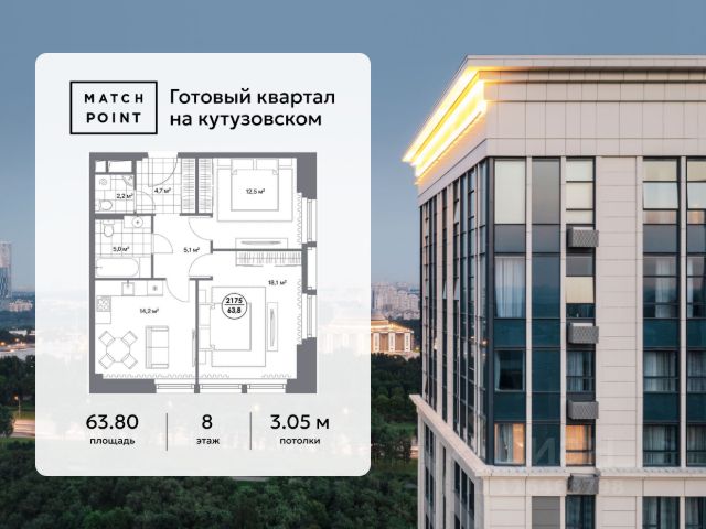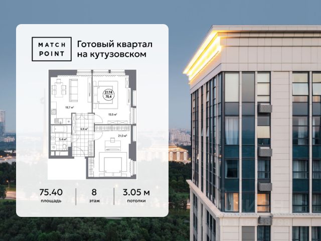 В премиальном квартале "Матч Поинт" на Кутузовском проспекте напрямую от девелопера ГК "Галс-Девелопмент" представлены трехкомнатные апартаменты общей площадью 75,4 м². Уникальное пространство свободной планировки, увеличенная площадь остекления и большое количество окон позволяют воплотить любые идеи в создании интерьера. Просторные и светлые апартаменты на 8 этаже с неповторимыми видами на Парк Победы — фактически первый ряд главных салютов города. Окна выходят на три стороны света — север, юг и запад. Дневной мягкий свет и теплое закатное солнце создают в доме атмосферу уюта и покоя. Вариант планировочного решения: Кухня-гостиная 18,7 м² — место для отдыха и встреч с близкими вдали от городской суеты. Здесь можно устроить вечер с друзьями или погрузиться в чтение любимой книги, наслаждаясь панорамным видом из окна. Две просторные спальни площадью 19,5 и 21 м² обеспечивают комфорт для полноценного отдыха и восстановления сил. Пространство позволяет разместить шкаф в нише. Прихожая 9,8 м² — функциональная зона для встречи гостей. О жилом квартале "Матч Поинт" Расположение, доступность, инфраструктура. Жилой квартал расположен в престижном районе Москвы — рядом с Кутузовским проспектом, Триумфальной аркой и станциями метро "Парк Победы", "Филевский парк", "Багратионовская" и "Минская". Парк Победы, Поклонная гора и Филевский парк создают прекрасные условия для отдыха. Вблизи расположены МГУ и МГИМО. Из окон комплекса открываются виды на Парк Победы, панораму Кутузовского проспекта, "Москва-Сити" и Москву-реку. В квартале работает полноценная инфраструктура: более 10 салонов красоты, аптека, химчистка, ателье, зоосалон, цветочный магазин, фотостудия. Есть кафе и рестораны, спортивные площадки, фитнес-клубы, детские центры и билингвальный детский сад. Трехуровневый подземный паркинг рассчитан на 1600 мест. Территория оборудована системой видеонаблюдения и современными системами безопасности.