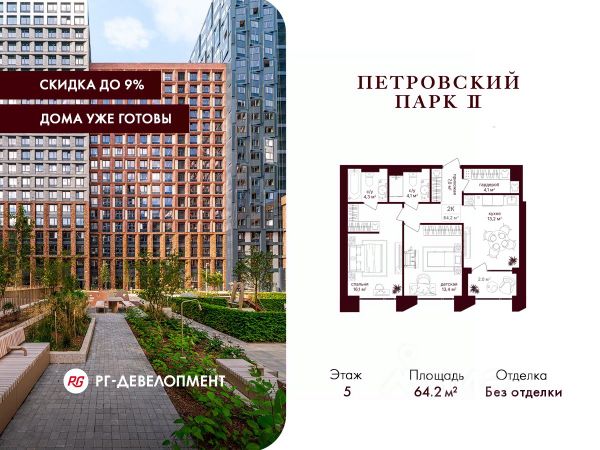 Продаётся 1-комнатная квартира 43,9 кв.м. в ЖК "Петровский парк II" на 2-м этаже 24 этажного дома. Скидка 9% при покупке квартиры! Цена указана с учетом максимального размера скидки. Компания "РГ-Девелопмент" предоставляет скидки на квартиры в жилом комплексе. Акция действительна с 01.11.2025г. до 30.11.2025г. включительно. Для того чтобы воспользоваться предложением, необходимо подписать договор на приобретение недвижимости до 30.11.2025г., включительно. ЖК "Петровский парк II" расположен в историческом районе Москвы, в 5 минутах от парка и станции метро "Динамо". Архитектуру от Syntaxis характеризуют асимметричные фасады, геометрические выступы, напоминающие волны. Эстетика архитектурных форм продолжается в интерьере внутренних пространств - двух центральных лобби и входных группах. На закрытой территории зеленые зоны с цветниками, места для отдыха, спортивные и игровые площадки. Подземная парковка, близость основных магистралей и удобные выезды, которые дают возможность жителям комплекса быть в центре культурной и общественной жизни. Комфортной жизни на территории комплекса расположены магазины, рестораны, частный детский сад.