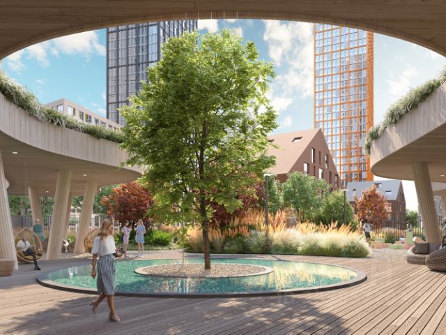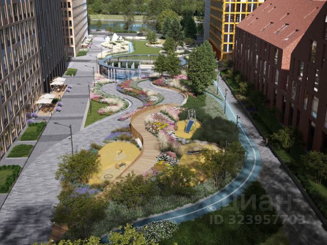 "Двор без машин" с детскими и спортивными площадками, зонами отдыха и ландшафтным дизайном.