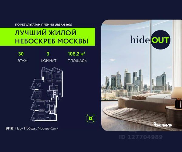 Прямая продажа от застройщика. Продается 2-комнатная квартира площадью 71,5 кв.м. на 4-м этаже 34-этажного дома в ЖК hideOUT с панорамными видами: Во двор. Высота потолков 3,25 м. hideOUT — премиальный проект компании Dominanta. Это новый уровень жизни и комфорта без компромиссов. Две башни — 34 и 49 этажей — открывают захватывающие виды на Москву. Архитектурной доминантой проекта становится мост, соединяющий башни на высоте 80 метров. Закрытая территория, охрана 24/7, зона экстренной безопасности на подземном уровне, система пожаротушения. На мосту между башнями на 22-м этаже находится SocialHUB — предусмотрено 16 комфортных пространств для работы, отдыха и развлечений с панорамными видами и клубным форматом доступа. Концепция благоустройства hideOUT — баланс между природой и технологичным городом будущего. На территории сада предусмотрены 15 зон для отдыха, работы, спорта и детей. Знаковым местом станет центральная площадь с амфитеатром и водопадом — сочетание камней, растений и струящейся воды создает идеальный баланс с природой. В проекте действуют привлекательные условия покупки: - семейная ипотека на старых условиях - успейте вдвое больше до 31.01.2026. - скидка до 20% при 100% оплате стоимости лота и ипотеке без субсидирования. Предложение действует до 31.01.2026. - рассрочка 0% на 3 года с первоначальным взносом от 20%. Период рассрочки до 36 месяцев. Застройщик АО "СЗ "ХАЙДАУТ", ИНН 7729058636, ОГРН 1027739319420. Проектная декларация на сайте наш.дом.рф. Предложение не является публичной офертой.