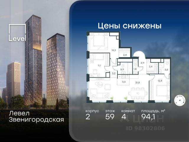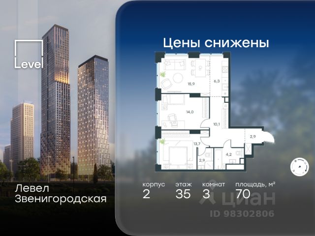Цена указана с учётом скидки при 100%-й оплате, несубсидированной ипотеке, рассрочке (кроме программы "Рассрочка 0%"). В жилом квартале продаётся 2-комнатная квартира площадью 48.10 кв.м без отделки. Квартира расположена на 46 этаже 64 этажного корпуса 2 в жилом комплексе комфорт класса Левел Звенигородская (компания Level Group/Левел групп). Отличная транспортная доступность - 5 мин. пешком до метро "Звенигородская" (откроется к окончанию строительства); - 18 мин. пешком до станции МЦК "Хорошёво" и станции БКЛ "Народное ополчение"; - 4 мин. на авто до ТТК; - 8 мин. на авто до Садового кольца; - 15 мин. на авто до Кремля. Продуманный архитектурный проект - Концепция от студии Станислава Михаловского, в основу которой легло единение природы и города; - Двухкамерные стеклопакеты в окнах, алюминиевый и ПВХ профиль - в квартирах тепло зимой и прохладно летом; - С верхних этажей открываются панорамные виды на город, Москву-реку, "Москва-Сити" и Москворецкий парк; - Лобби со всеми удобствами: окна в пол, высокие потолки до 4,7 м, лаунж-зоны, колясочные, гостевые санузлы и мойки для лап животных; - Централизованные водонагреватели гарантируют круглогодичную подачу горячей воды в каждую квартиру. Благоустройство Концепция благоустройства разработана совместно с бюро UNK landscape. Высота башен приближается к 200 метрам - они словно касаются неба. Небесный простор проецируется на территорию двора с помощью подсветки, визуально увеличивая пространство и отражаясь в авторских элементах архитектуры. На территории площадью 0,45 га расположатся: - "Облако событий" - место встреч и общения; - "Облако спорта" - всё для поддержания себя в форме; - "Облако принятия решений" - пространство для работы на свежем воздухе; - "Облако спокойствия" - для отдыха в тишине природы; - "Облако игр" - площадки для подростков и самых маленьких. Инфраструктура В жилом комплексе откроется 21 коммерческое помещение: продуктовые лавки, кафе, салоны красоты, службы доставки и творческие студии. Этап 1 включает строительство двухуровневого подземного паркинга. Всего здесь расположится 351 машино-место, включая семейные места, и 264 кладовых помещения. В распоряжении жителей развитая инфраструктура района: 15 супермаркетов, 5 спортивных объектов, 9 медучреждений, 7 детских садов, 4 школы, 3 благоустроенных парка - всё в шаговой доступности. Инженерия Комфортное перемещение внутри домов будут обеспечивать надёжные лифты с доступом в паркинг с жилых этажей. В каждом корпусе предусмотрено до шести кабин, включая сервисные лифты. Попасть на территорию комплекса можно только по единому ключу доступа. Видеонаблюдение установлено на входах в подъезды, в лобби, в общих зонах, на въезде в паркинг. Гости смогут связаться с жителями дома через входные видеопанели, а управлять доступом на территорию можно через видеодомофон или приложение на телефоне.