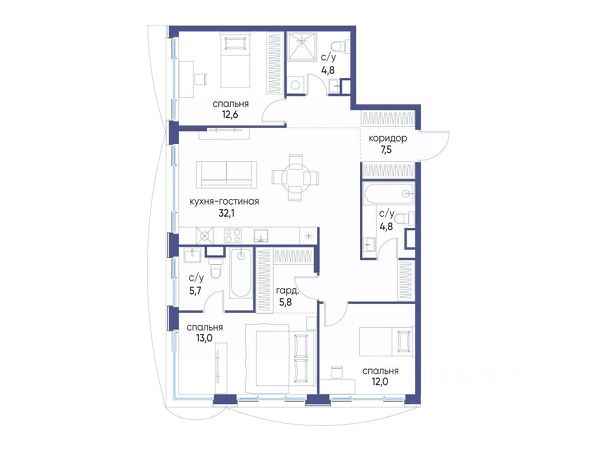 Планировка: просторная кухня-гостиная, мастер-спальня с гардеробной, совмещенный с/у, гостевая спальная, гостевой с/у, гардеробная и просторный холл.