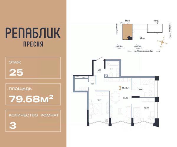 Рассрочка 0% с первым взносом от 20%, ипотека с субсидией или наличные. Подберём способ оплаты индивидуально. Продается 4комнатная квартира на 25 этаже от застройщика Страна Девелопмент. Площадь квартиры 79.58 кв. м. Дизайн-квартал "Republic" — новый проект премиум-класса в Москве от федерального застройщика "Страна Девелопмент". ЦАО, Пресня, 7 мин. от метро "Белорусская". 10 жилых башен и 4 восстановленных здания локомотивного депо образуют уникальное пространство. "Republic" — место, где вы ощутите гармонию истории и современности. За 12 мин. вы сможете дойти до Московского зоопарка, за 10 мин. на авто доехать до Патриарших прудов и Белого дома. Преимущества • Благоустройство. SPA-комплекс с бассейном и термами, гастрономический, учебный и шопинг-центры, приватный бульвар и яркие арт-пространства — для жителей предусмотрены все элементы премиального комфорта. • Панорама на центр. Наслаждайтесь видами ЦАО каждый день: панорама на историческую Пресню и башни Москва-Сити — из своей квартиры или с приватной террасы на крыше. • Концептуальное лобби в каждой башне. С общей террасой на кровле, с библиотекой, коворкингом и фитнес-рум. Стойка консьержа перетекающая в бар и др. • Современные форматы квартир. Свободные планировки, с террасой или балконом, с возможностью установки камина, от 1-комнатных до пентхаусов. • Отделка Квартиры сдаются без отделки или в формате White box. При White box уже выполнены все шумные и грязные работы: произведена разводка электричества с подрозетниками, установлены откосы из гипсокартона, устроена стяжка пола с шумоизоляцией и др. Способы покупки Сотрудники "Страна Девелопмент" будут сопровождать вас на каждом этапе сделки, помогут получить одобрение по ипотеке или снизить ежемесячный платеж. - ипотека (стандартная/с субсидией/траншевая) - рассрочка (с ПВ от 20%) - с использованием материнского капитала - оплата наличными