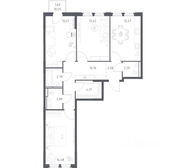 Продаётся 4-комнатная квартира в строящемся доме (Корпус 2), срок сдачи: II-кв. 2027, общей площадью 88.1 кв.м., на 6 этаже. ЖК "Киноквартал" , МО, г. Королев, мкр. Первомайский, ул. Солнечная, д. 2