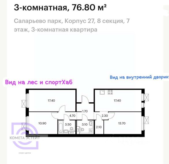 Продается четырехкомнатная квартира без отделки в 7 фазе города-парка "Первый Московский". Общая площадь квартиры - 102,4 кв. м, этаж 12 из 20. Срок сдачи - 1 квартал 2027 года. Тип дома - монолитный. Цена указана при 100% оплате. Новый корпус состоит из 3 секций: - 1 и 2 секции - с отделкой White Box с возможностью приобретения чистовой отделки за дополнительную плату - 3 секция - без отделки Город-парк "Первый Московский" расположен всего в 7 км по Киевскому шоссе (Новая Москва). Из города-парка прямой выезд на Киевское шоссе и трассу Солнцево-Бутово-Варшавское шоссе. ТРАНСПОРТНАЯ ДОСТУПНОСТЬ: - 5 мин. на личном автомобиле или 10 мин. на автобусе 189 и 147 до станции метро "Филатов Луг" - 25 мин. пешком до станции метро "Филатов Луг" ИНФРАСТРУКТУРА: Около 7 фазы запланировано строительство детского сада, школы, 2 многоуровневых паркингов. Также на территории проекта есть все необходимые объекты действующей социальной и бытовой инфраструктуры: 8 детских садов, 6 школ, ТЦ, магазины, паркинги, аптеки и др. БЛАГОУСТРОЙСТВО: - Дворы без машин - Игровые зоны для детей, зоны для занятия спортом, зоны для отдыха с навесами/качелями - Детские площадки разделены по возрастным группам - Пешеходный и веломаршрут с двухполосной велодорожкой 2,5 м в ширину - Озеленение с растениями всесезонного цветения ОСОБЕННОСТИ АРХИТЕКТУРЫ: В каждой секции 3 корпуса предусмотрены: - колясочные во входных группах - кладовые помещения с -1 по 20 этажи - коммерческие помещения на 1 этажах - по 4 лифта: 2 пассажирских, 2 грузовых - видеонаблюдение, установленное в холлах первых этажей, у подъездов и на прилегающей территории АВТОРСКИЙ ДИЗАЙН: Входные группы выполнены по авторскому дизайну, оснащены системой "тёплый пол". В каждой входной группе будет располагаться комфортабельная зона ожидания с мягким диваном, акцентными пуфами и столиком.
