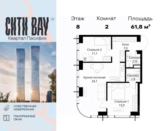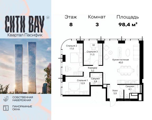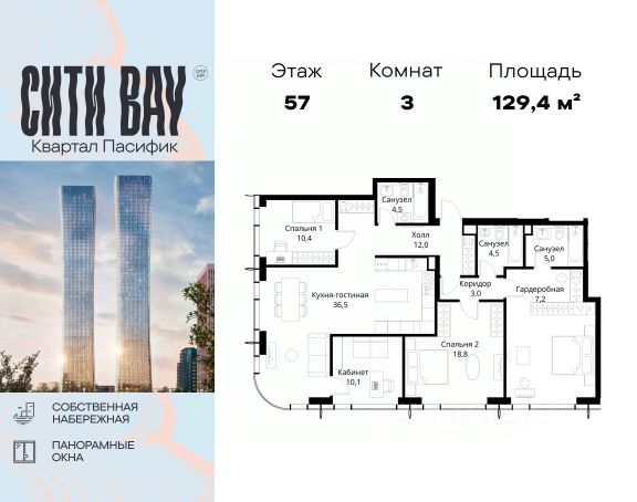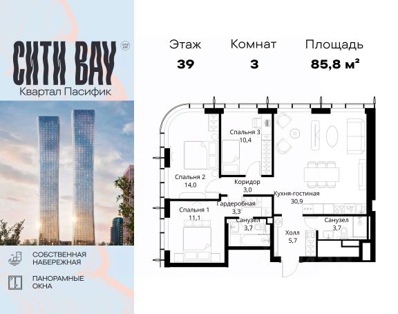 Прямая продажа от застройщика. Продаётся 3-комнатная квартира общей площадью 81.30 м² без отделки в ЖК Сити Бэй, квартале Пасифик, на 9-м этаже 59 этажного дома. Концепция жилого комплекса Сити Бэй - настоящий город в городе с отлично развитой инфраструктурой и собственной благоустроенной набережной. На территории жилого комплекса расположено пять кварталов - Атлантик, Пасифик, Индиан, Норс, Клиф. Жилой квартал Сити Бэй отличается оригинальной концепцией и выделяется среди других проектов такими характеристиками как: - Архитектура, - Виды из окон, - Природное окружение, вызывая гордость у жителей и восхищение у прохожих. Вся жизнь района Покровское-Стрешнево строится вокруг водных объектов: - Пойма реки Сходни с уникальной экосистемой, - Речка Химка и Химкинское водохранилище, - Москва-река, - Канал имени Москвы. Кругом вода, и местные с удовольствием этим пользуются. А сразу за рекой - центр водного спорта в Строгино с вейк-парком и яхт-Клубами. Помимо воды, здесь очень много зелени: - Рядом Сходненский ковш памятник природы, естественный амфитеатр глубиной 40 метров; - Парк при усадьбе Братцево с фруктовым садом; - Дубовая роща "Маяк", - Алешкинский лес; - Лесопарк Покровское-Стрешнево с пляжами и бобрами. Главные транспортные артерии района: - Волоколамское шоссе, - Таганско-Краснопресненская линия метро и МЦД-2. Всего за 20 минут можно добраться до центра на машине или метро, а МЦД связывает ЖК Сити Бэй с северными, восточными и юго-восточными районами. Компания MR предлагает своим клиентам специальные условия приобретения квартир в рамках программ ипотечного кредитования от банков-партнеров.