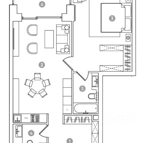 Комфортная планировка включает в себя просторную кухню-гостиную, спальню, гардеробную, санузел и удобную прихожую.