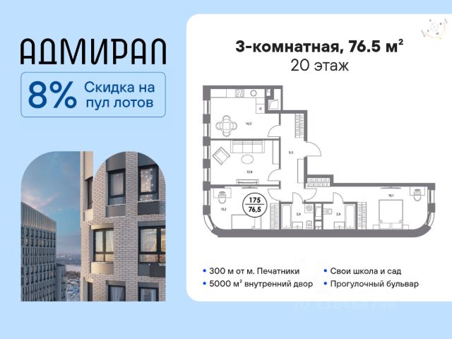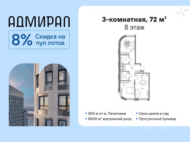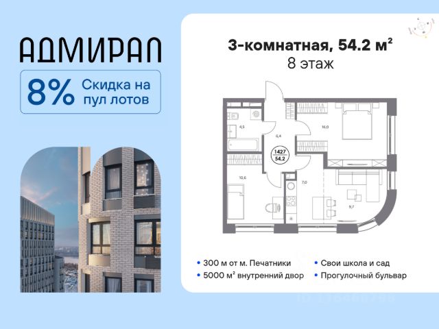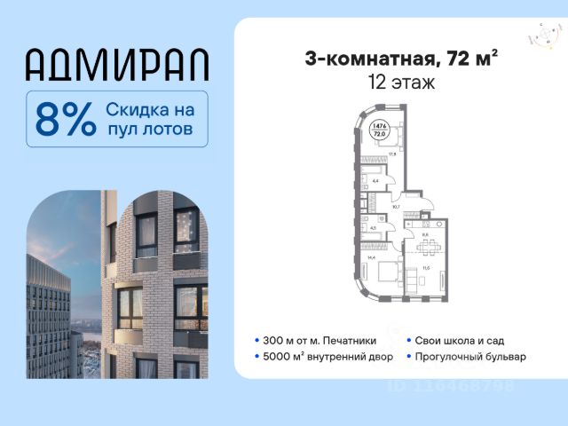 В динамично развивающемся районе Москвы, всего в 300 метрах от метро и в пешей близости от нового городского порта с протяженной набережной 13 км, свободной от автомобилей, продается 3-комнатная квартира площадью 60.00 м². без отделки. Квартира находится в корпусе жилого комплекса бизнес-класса "Адмирал", расположенного по адресу г. Москва, ул. Шоссейная, 4Д. (Застройщик - "Галс Девелопмент"). Новый амбициозный проект "Адмирал" станет частью одного из самых перспективных районов будущего - "Сити-2". В пешей доступности от современных башен Вас ждут живописные Люблинские пруды, 2 усадьбы с уникальной историей и уютный парк "Печатники" у Перервинского плёса. Район имеет отличную транспортную доступность: • 300 метров до станции метро "Печатники"; • Удобная пересадка на БКЛ и станцию МЦД-2; • 10 минут на машине до ТТК; • 15 минут до Садового кольца. Архитектура корпусов отличается динамичностью облика благодаря переменной этажности: высокие башни сочетаются с домами средней этажности. Изящным украшением становятся арочные витражи. Интеллигентный и современный стиль "Адмирала" продолжается в гранд-лобби: пастельные оттенки интерьера и фактурные элементы декора создают атмосферу безмятежного отдыха, особое ощущение простора дарят высокие потолки до 4 м и витражные окна. В домах предусмотрено от трех до шести скоростных лифтов, каждый из них спускается на любой этаж подземного паркинга и обладает удобными сенсорными панелями управления и низким уровнем шума. Благоустроенный двор площадью 5000 кв.м. украсят десятки видов гипоаллергенных растений. Здесь можно совершить приятный променад, по пути заглядывая за свежезаваренным кофе, уединиться за ноутбуком в комфортном коворкинге, занять ребенка играми в двухъярусном плейхабе или помедитировать на специальной площадке для йоги. Мягкий свет декоративных фонарей подчеркнет живописность местности, а чувство безопасности гарантируют круглосуточные системы видеонаблюдения. Дополнительные преимущества: • Высокие потолки от 2,9 до 3,25 м; • Бизнес-центр, школа и детский сад прямо на территории дома; • Подземный двухуровневый паркинг на 1955 машино-мест; • Кладовые помещения в тёплом контуре на 2м этаже; • Стрит-ритейл на первых этажах. Продается элитная квартира, жильё на улице Шоссейная в Москве.