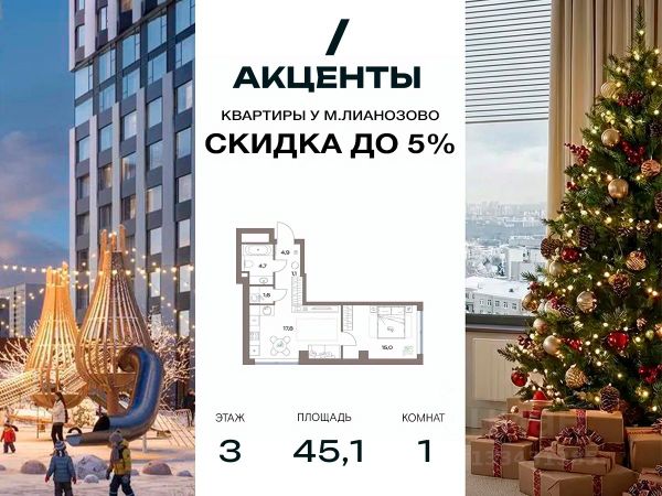 Трехкомнатная евроквартира для большой семьи. -Угловая планировка с видом на 2 стороны -Мастер-спальня с личной ванной и местом для гардеробной и детская с угловым остеклением -В квартире предусмотрено смешанное остекление -Дополнительные окна в комнатах наполнят квартиру светом и теплом -Вторая спальня для организации детской или рабочего кабинета -Большая кухня-гостиная в центре квартиры для семейных торжеств -Удобная ниша в коридоре для системы хранения -Второй санузел для удобства каждого члена семьи -Наслаждайтесь видами и созерцайте закаты на балконе -Окна в пол в зоне балкона Молодой район для жизни "Акценты" в классе бизнес-лайт — точка роста на севере Москвы. Он предлагает элегантные и строгие фасадные решения, авторский ландшафтный дизайн, а также функциональные и доступные по цене планировки. Проект находится в семи минутах пешком от станции метро "Лианозово" и одноименной МЦД-1. Добраться до МКАД можно будет за 10 минут на авто, а дорога до центра займет около 20 минут. Жилой комплекс, расположенный в районе Восточного Дегунино, предлагает развитую инфраструктуру для тех, кто ценит выбор. Он имеет удобный доступ не только к транспорту, но и к паркам, школам, садам, больницам и другим социальным объектам. В пешей доступности находятся 4 поликлиники, 5 школ, 6 детских садов, 3 бассейна и баскетбольная академия. Еще рядом есть несколько лесопарков: "Лианозово" с аттракционами и спортивными площадками для тенниса, волейбола и баскетбола, "Останкино" с конным клубом, прудом и пейнтбол-площадками. А "Северные Дубки" — это завораживающее пространство для прогулок под кронами вековых дубов, берез и лип. Кроме того, в районе не будет скучно и юным жителям. Можно оттачивать трюки в скейтпарке "Союз". Ловким и прыгучим советуем записаться в акробатический центр "Белка". Купить квартиру - элитное жильё в районе Восточное Дегунино в Москве.