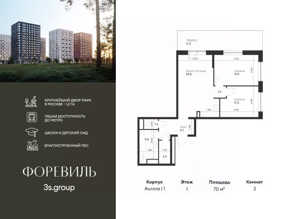 Предчистовая отделка в подарок! Пешая доступность от метро и московская прописка! Продается уютная 1-комн. квартира площадью 40,8 кв.м на 1 этаже 17 этажного жилого комплекса бизнес-класса Foreville от 3S Group. Общая площадь: 40,8 кв.м., жилая: 22,3 кв.м., площадь кухни-гостиной: 18,2 кв.м., высота потолков: 4,22 м., окна выходят во двор. Квартира предлагается без отделки, что идеально подходит для воплощения собственного дизайнерского решения. Также доступна опция предчистовой отделки, стоимость которой включается в общую цену квартиры. О проекте: Пространство Комплекс располагает крупнейшим приватным двор-парком в Новой Москве площадью 1,2 Га, предлагая жителям огромное пространство для отдыха, спорта и игр на свежем воздухе. Природный ландшафт Внутренний лесопарк с более чем 183 взрослыми деревьями и 10 320 цветущими кустарниками создает уникальную природную атмосферу для каждого времени года. Игровые и спортивные зоны Обширные площадки с безопасным покрытием, специализированные зоны для детей разных возрастных групп и взрослых, включая воркаут и настольный теннис, способствуют активному и здоровому образу жизни. Экологичность и долговечность Использование натуральных материалов, таких как лиственница, и крупноформатной бетонной плитки для покрытия, подчеркивает стремление проекта к экологичности и устойчивости. Безопасность и уединение Внутренний двор без машин обеспечивает безопасность для детей и спокойствие для взрослых. Территория огорожена и находится под круглосуточным видеонаблюдением. Сохранение времени Благодаря превосходной транспортной доступности и близости к новой станции метро Корниловская, Foreville позволяет жителям экономить время для семьи и отдыха на природе, минимизируя необходимость длительных поездок. Foreville не просто жилье, а целая экосистема для комфортной и гармоничной жизни на свежем воздухе, совмещая преимущества городской инфраструктуры и непосредственную близость к природе.