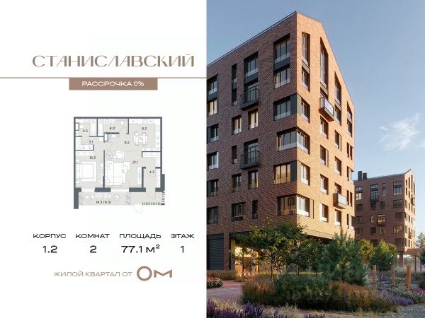 Беспроцентная рассрочка от застройщика. В продаже 2-комнатная квартира квартира площадью 77.1 м², расположенная на 1 этаже в жилом квартале "Станиславский" — проекте бизнес-класса на Новорижском шоссе, всего в 10 минутах от Москвы. В квартире 279 Дом 1 (Корпус 1.2, секция 9) высота потолков — от 3 метров, просторная планировка с гардеробной и большой кухней-гостиной создают комфорт и свободу для воплощения ваших идей. В проекте есть разнообразные отделочные решения, что позволяет реализовать любые дизайнерские предпочтения и планировочные идеи. В "Станиславском" представлены квартиры на любой вкус и для любой семьи: студии, классические и европланировки, а также крупные 4- и 5-комнатные варианты. Все помещения предлагаются без отделки, что дает свободу для создания уникального пространства. Обустроенная территория предусматривает функциональное зонирование: зеленые бульвары, природные тропы, интерактивные зоны, центральная площадь с подиумом для мероприятий и спортивный кластер. Для жителей предусмотрены разнообразные сценарии досуга: тихие зоны для общения, массажные тропы и сад ароматных трав для оздоровления, всесезонные уличные игры и открытые поляны для спортивных и настольных развлечений. Также есть познавательная зона с огородом, скворечниками и микроскопами. В концепции ЖК "Станиславский" особое внимание уделено въездной зоне: здесь создана комфортная площадка для встреч с гостями, обрамленная живой изгородью. Отсюда также открывается доступ к специально оборудованной территории для выгула питомцев — всё продумано для удобства и уюта жителей.