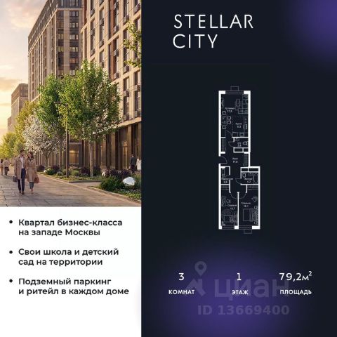 Продается квартира от надежного застройщика Tashir Estate в квартале бизнес-класса Stellar City в ЗАО Москвы. Площадь квартиры составляет: 71.7 кв. м, потолки: 3.1 м Квартира находится на 1 этаже, 4 корпуса жилого квартала Stellar City — микрогорода будущего на орбите Москвы. Stellar City — квартал в ЗАО Москвы вблизи инновационного центра Сколково. В окружении — 11 парков и природных зон, в том числе Долина реки Сетунь, Мещерский лес и парк развлечений The Rink. Город в городе Чтобы дом и инфраструктура вокруг отвечала динамичному лайфстайлу жителя мегаполиса, в основу проекта легла концепция город в городе, которая позволяет решать все бытовые вопросы in-home. В квартале будут возведены школа и детский сад, воркаут-зоны, променад, вело и беговые дорожки, детские площадки для каждого корпуса, а также коммерция на первых этажах для ежедневных покупок. Все необходимое — на расстоянии нескольких шагов. Изящные и лаконичные лобби Авторский дизайн, натуральные материалы в отделке и безупречный интерьер вне времени. Лобби и холлы в проекте бизнес-класса Stellar City ничем не отличаются от входных групп в премиум-сегменте благодаря качественным европейским материалам в отделке, стильному дизайну, консьерж-сервису и уютной зоне ожидания с журнальными столиками и мягкой мебелью. Комфорт и безопасность Закрытая территория, охрана, система СКУД, специально разработанное мобильное приложение дома для резидентов и подземный паркинг с круглосуточным наблюдением и доступом с помощью автоматического считывания номера авто.