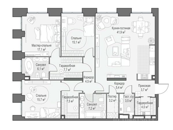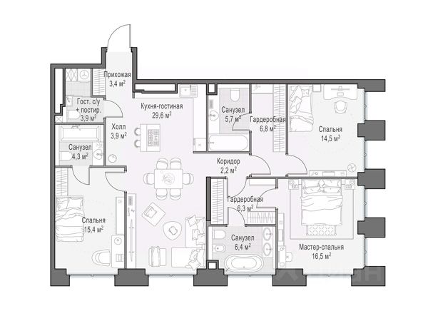 Роскошный двухэтажный пентхаус, из окон которого открывается прямой вид на парк "Красногвардейские пруды" и внутренний двор-парк. Площадь 422,3 кв. м позволяет с комфортом расположить четыре спальни, просторную гостиную и кабинет. Гостиная с камином, выходом на террасу и панорамными видами станет точкой притяжения всей семьи. Сценарии времяпрепровождения и отдыха на просторной террасе, площадью 121,6 кв. м разнообразны: обеденная зона, лаундж-пространство, лежаки для принятия солнечных ванн. Life Time - роскошный современный квартал на Пресне, в наиболее быстро растущем премиальном районе ЦАО. Его насыщенная инфраструктура и выгодное расположение дарят время для жизни. Вы больше не тратите его на дорогу или ожидание, при этом ни в чём себе не отказывая. На территории предусмотрено всё для комфортной жизни: • двор-парк площадью 1,8 гектара с прудом и фонтанами; • Clubhouse - инфраструктурный центр в отдельном здании с исчерпывающими возможностями для спорта, отдыха и досуга только для жителей; • спортивная инфраструктура на улице и в помещении, в том числе бассейн длиной 25 метров, хот-таб, хаммам, сауна, бьюти-зона; • клубная гостиная с террасой; • всё для развития и досуга детей любого возраста, в том числе детский сад и школа. Life Time находится в центре сложившегося премиального района, в окружении многочисленных парков. Удобная транспортная доступность и прямой выезд на Звенигородское шоссе позволяют без проблем добраться до Садового кольца и Москва-Сити. Архитектурный стиль квартала - роскошный минимализм. Дома десятилетиями будут выглядеть современно.