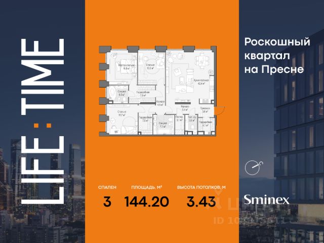 Просторная светлая квартира площадью 106,8 кв. м с окнами в тихий приватный двор-парк с ландшафтным дизайном и на северную панораму города. Большое панорамное окно в с/у с возможностью открывания настежь улучшает видовые характеристики. Продуманная планировка позволяет разместить две спальни с отдельными санузлами и гардеробными. Life Time - роскошный современный квартал на Пресне, в наиболее быстро растущем премиальном районе ЦАО. Его насыщенная инфраструктура и выгодное расположение дарят время для жизни. Вы больше не тратите его на дорогу или ожидание, при этом ни в чём себе не отказывая. На территории предусмотрено всё для комфортной жизни: • двор-парк площадью 1,8 гектара с прудом и фонтанами; • Clubhouse - инфраструктурный центр в отдельном здании с исчерпывающими возможностями для спорта, отдыха и досуга только для жителей; • спортивная инфраструктура на улице и в помещении, в том числе бассейн длиной 25 метров, хот-таб, хаммам, сауна, бьюти-зона; • клубная гостиная с террасой; • всё для развития и досуга детей любого возраста, в том числе детский сад и школа. Life Time находится в центре сложившегося премиального района, в окружении многочисленных парков. Удобная транспортная доступность и прямой выезд на Звенигородское шоссе позволяют без проблем добраться до Садового кольца и Москва-Сити. Архитектурный стиль квартала - роскошный минимализм. Дома десятилетиями будут выглядеть современно.