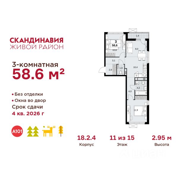 Продается трехкомнатная квартира 527 в новостройке Жилой район "Скандинавия" по адресу Москва, ТиНАО, Новомосковский АО, Сосенское С/П, Коммунарка пос., жилой комплекс Скандинавия, 18.2.4, район Коммунарка, Новомосковский административный округ, Москва. Общая площадь квартиры - 58.60 кв. м., этаж 11 из 15, секция 7. Тип проекта, по которому построен дом - монолит, компания-застройщик - ООО "А101". Стоимость квартиры - 19485672 Р. Срок сдачи - 4 квартал 2026. ПРЕДЛОЖЕНИЯ ОТ ЗАСТРОЙЩИКА В ОКТЯБРЕ 2025: Ипотека от 13,9 % для всех! На весь срок. "Семейная ипотека" вернулась. Ставка от 3,5 % на весь срок! Без удорожания! Выгодное ипотечное комбо: Ипотека от 2200 р./мес. и от 6 % после рождения ребёнка! Ипотека для всех "Держи пять!" - ставка 5 % на 2 года! *более подробную информацию по скидкам и акциям уточняйте в отделе продаж ЖК "Скандинавия" на границе Бутовского лесопарка (1610 га) - это баланс качественного жилья и сервисов, зелёных пространств для активного и созерцательного отдыха. Выразительная архитектура и цветовая гамма монолитных корпусов комфорт- и бизнес-класса (8-17 этажей) созвучны скандинавским мотивам, органично интегрированы в великолепный природный контекст. Огороженные дворы свободны от машин, в них продуманы места для отдыха и работы на свежем воздухе, озеленение, детские и спортивные площадки. Для прогулок, встреч и районных праздников - площадь Туве Янссон с "сухим" фонтаном, вековыми дубами и единственным в мире памятником писательнице; пешеходный променад 2 км; 3 крупных природных ручья; более 15 км велосипедных и прогулочных дорожек с арт-объектами. Инфраструктура района включает современные школы и детские сады, центр впечатлений, фитнес-клубы, развивающие и творческие центры, магазины, кафе, салоны красоты. На подземных этажах - паркинги и кладовые. Преимущества "Скандинавии": - ст. метро "Потапово" - 100 м от ближайших домов (открыта!) - удобные выезды на трассу Солнцево - Бутово - Варшавское шоссе и ул. Бачуринская - свои школы и детские сады - инфраструктура на первых этажах и рядом с домом - лесопарк, природные водоёмы, прогулочные маршруты