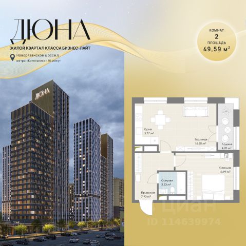 Современный жилой квартал бизнес-класса "Дюна" расположен в 10 минутах ходьбы от станции метро "Котельники" (1,2 км) на пересечении Новорязанского и Дзержинского шоссе. Квартал находится в районе с развитой инфраструктурой: в непосредственной близости расположены школы, детские сады, поликлиники, а также гипермаркеты и торговые комплексы, такие как "Metro", "Глобус", "Лемана Про" (Леруа Мерлен), "МЕГА Белая Дача", "Outlet Village Белая Дача" и другие. В шаговой доступности находятся физкультурно-оздоровительный комплекс с бассейном и теннисными кортами, а также благоустроенный лесопарк "Кузьминки" площадью 1189 га. Неподалёку расположены пляжи Дзержинских карьеров с экстрим-парком и горнолыжными трассами, Томилинский лесопарк с лыжной базой и Жулебинский лесопарк. Застройщик реализует современную урбанистическую концепцию "Город в городе", которая подразумевает наличие собственной полноценной инфраструктуры на территории жилого комплекса, включая школу, детские сады, торговую галерею, бизнес-центр, пункт полиции и медицинский центр. Общая площадь застройки составляет 12,2 га. Квартиры представлены в диапазоне планировок от студий до четырёхкомнатных, в обычном и евроформате. На этажах расположено от 3 до 4 бесшумных скоростных лифтов при количестве квартир от 4 до 7 на этаже. Квартиры сдаются с предчистовой отделкой (white box). Здания переменной этажности строятся по технологии монолит-кирпич, а фасады выполнены с использованием инновационной системы вентилируемого комбинированного фасада.Комфорт на внутренней территории обеспечивается за счёт принципа "двор без машин", системы доступа по карте и круглосуточного видеонаблюдения. Приобрести квартиру можно с использованием материнского капитала, беспроцентной рассрочки или ипотечных программ. При 100% оплате предусмотрены индивидуальные условия.
