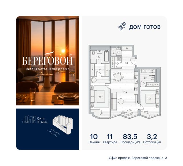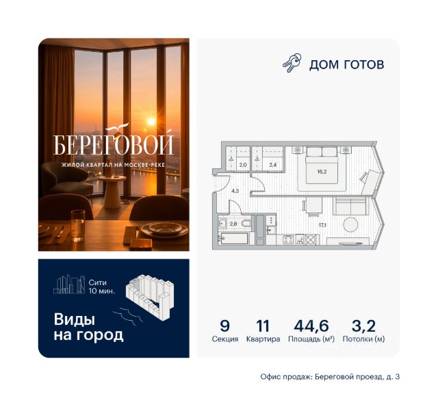 Река. Парк. Сити. Готовый дом в идеальном месте. Продается 3-комнатная квартира на 11 этаже с панорамным остеклением и видом на Береговой пр-д. Береговой — квартал-курорт в центре столицы. Готовый дом на первой линии Москвы-реки. Пешеходная набережная начинается прямо от дома — никаких дорог между вами и рекой. Уникальное сочетание природы парка Фили и ритма Сити. Ключи от нового образа жизни в Береговом: • 12 террас на крышах — ваши виды на Москву с высоты птичьего полета • Пешеходная набережная прямо у дома — ни одной машины между вами и рекой • Лобби с камином, переговорной и консьерж-сервисом • Флагманский Encore Fitness — самый большой в сети (4700 м²) с бассейном, термами и спа-комплексом • Детство на берегу Москвы-реки — в рамках проекта будут построены две школы и детский сад рядом с домом • Гастрономическая набережная: рестораны и премиум-сервисы откроются на первых этажах • Причал "Береговой" рядом с домом — путешествуйте по городу, пока другие стоят в пробках • Безопасность и уединение: контроль доступа на территорию, видеонаблюдение и круглосуточная диспетчерская • Двухуровневый подземный паркинг и кладовые Безупречная квартира для жизни: • Пространство света и воздуха: панорамные окна и высокие потолки 3.2 м • Технологии: центральное кондиционирование и роботизированная система очистки фасадов — вид из окна всегда будет идеальным • Совершенство планировки: просторная кухня-гостиная, минимум коридоров, максимум полезной площади • Квартира без отделки — возможность раскрыть преимущества планировки в вашем уникальном интерьере. Или выбирайте свою версию идеального дома в коллекции планировок: • С изолированными спальнями • Мастер-спальнями с гардеробными и ванными • Видовые ванные комнаты • Функциональные постирочные Эксклюзивные лоты: • Пентахусы с приватными террасами • Двухуровневые пентхаусы Локация, о которой мечтают 15 минут до Сити на машине — и вы в эпицентре деловой жизни. Две станции метро в пешей доступности — когда каждая минута на счету. Утром — пробежка по парку Фили, вечером — прогулка на велосипеде вдоль реки, выходные — водный спорт в Крылатском. Речные трамвайчики вместо такси, зеленые парки и благоприятная экология — привилегии престижного ЗАО Москвы. Условия покупки: выгодные программы покупки от застройщика, специальные условия при полной оплате. Оставляйте заявку на персональную презентацию в шоу-руме.