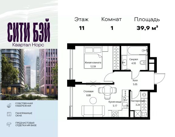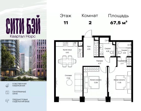 Прямая продажа от застройщика. Продаётся 2-комнатная квартира общей площадью 59.10 м² с предчистовой отделкой в ЖК Сити Бэй, квартале Норс, на 11-м этаже 27 этажного дома. Концепция жилого комплекса Сити Бэй - настоящий город в городе с отлично развитой инфраструктурой и собственной благоустроенной набережной. На территории жилого комплекса расположено пять кварталов - Атлантик, Пасифик, Индиан, Норс, Клиф. Жилой квартал Сити Бэй отличается оригинальной концепцией и выделяется среди других проектов такими характеристиками как: - Архитектура, - Виды из окон, - Природное окружение, вызывая гордость у жителей и восхищение у прохожих. Вся жизнь района Покровское-Стрешнево строится вокруг водных объектов: - Пойма реки Сходни с уникальной экосистемой, - Речка Химка и Химкинское водохранилище, - Москва-река, - Канал имени Москвы. Кругом вода, и местные с удовольствием этим пользуются. А сразу за рекой - центр водного спорта в Строгино с вейк-парком и яхт-клубами. Помимо воды, здесь очень много зелени: - Рядом Сходненский ковш памятник природы, естественный амфитеатр глубиной 40 метров; - Парк при усадьбе Братцево с фруктовым садом; - Дубовая роща "Маяк", - Алешкинский лес; - Лесопарк Покровское-Стрешнево с пляжами и бобрами. Главные транспортные артерии района: - Волоколамское шоссе, - Таганско-Краснопресненская линия метро и МЦД-2. Всего за 20 минут можно добраться до центра на машине или метро, а МЦД связывает ЖК Сити Бэй с северными, восточными и юго-восточными районами. Компания MR предлагает своим клиентам специальные условия приобретения квартир в рамках программ ипотечного кредитования от банков-партнеров.
